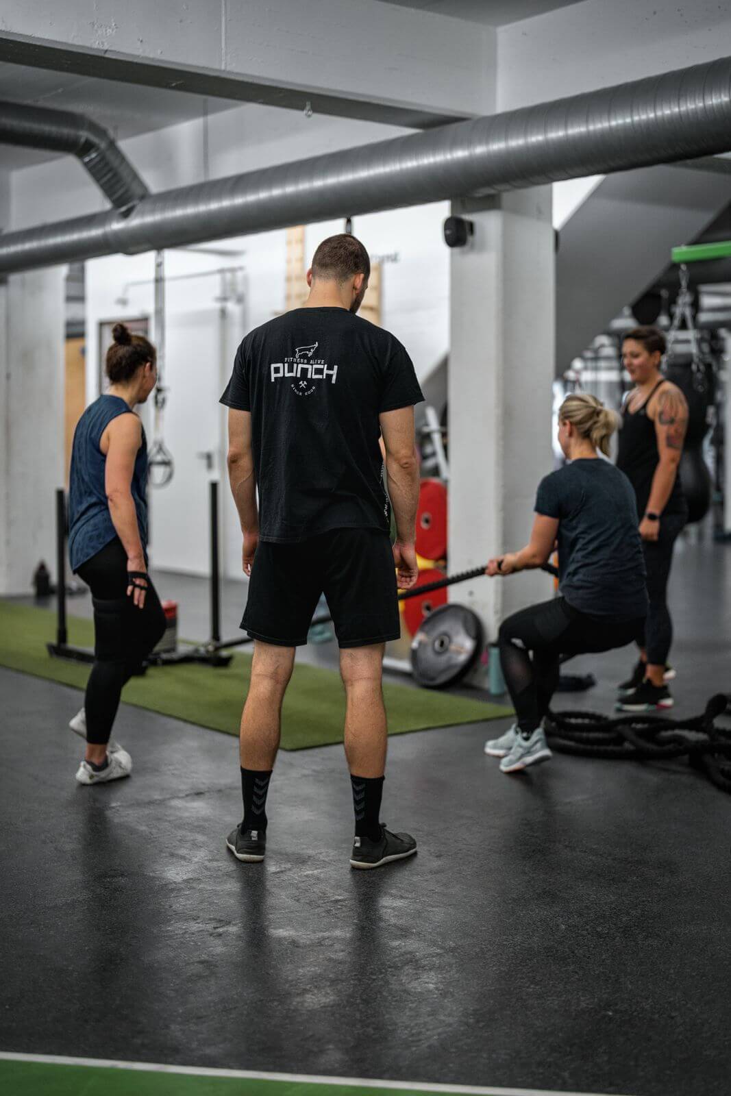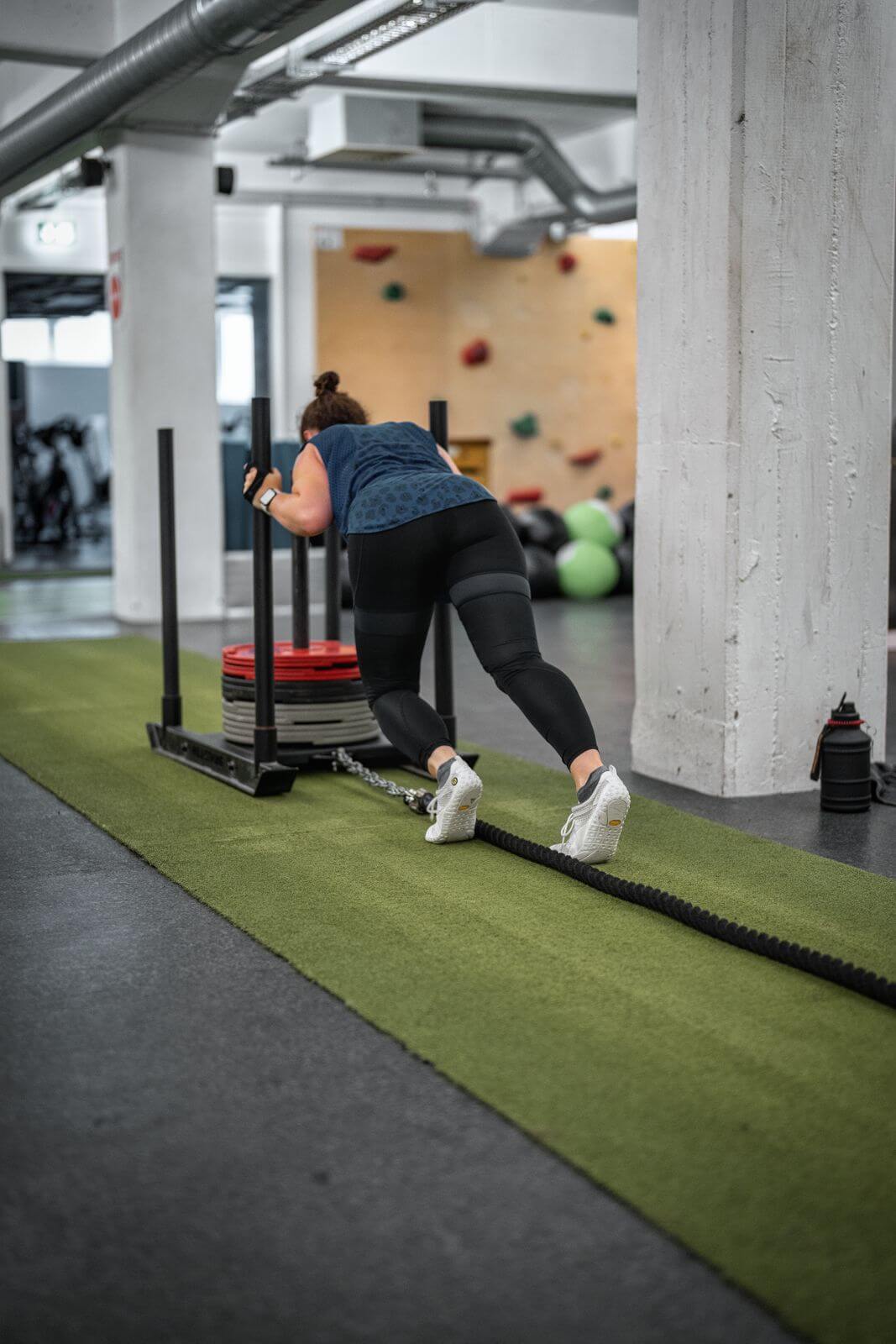 - Übungen wie Sandsäcke schmeißen, Kniebeugen, Schlitten schieben, etc. mit Materialien wie Lang- und Kurzhanteln, Kettlebells, Medizinbällen, Schlitten und vor allem Gewichten